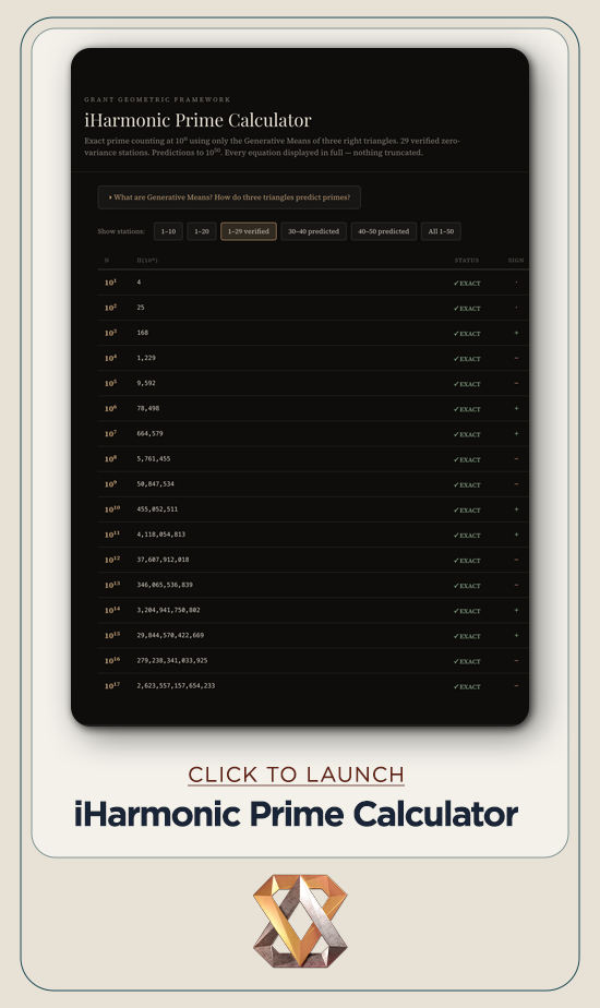 This paper is organized as follows. Sections 2–4 establish the iHarmonic Prime Identity and its geometric derivation. Section 5 develops the Nine Generative Means and Harmonic Floor Theory. Section 6 examines other examples of harmonic ratcheting in number theory. Section 7 develops the extended properties of the Nine Means. Section 8 establishes the periodic table framework. Section 9 develops isotopic mass and valence prediction through the two-triangle hierarchy, including the superparticular corridor and self-generative cascade. Section 10 derives fundamental constants from palindromic mirror closure. Sections 11–12 establish the Riemann zeta connection and the complementary triangle. Section 13 provides Python implementation. Section 14 gives exhaustive empirical results. Section 15 develops the Ratchet Geometric Prime Counting Function with three generative triangles and 30 zero-variance stations. Section 16 develops the geometric approach to the Riemann Hypothesis through Path A (direct equivalence) and Path B (zero-line locking). Section 17 constructs the spectral theory of the Alphahedron operator and proves eigenvalue confinement to the critical line. Section 18 concludes.