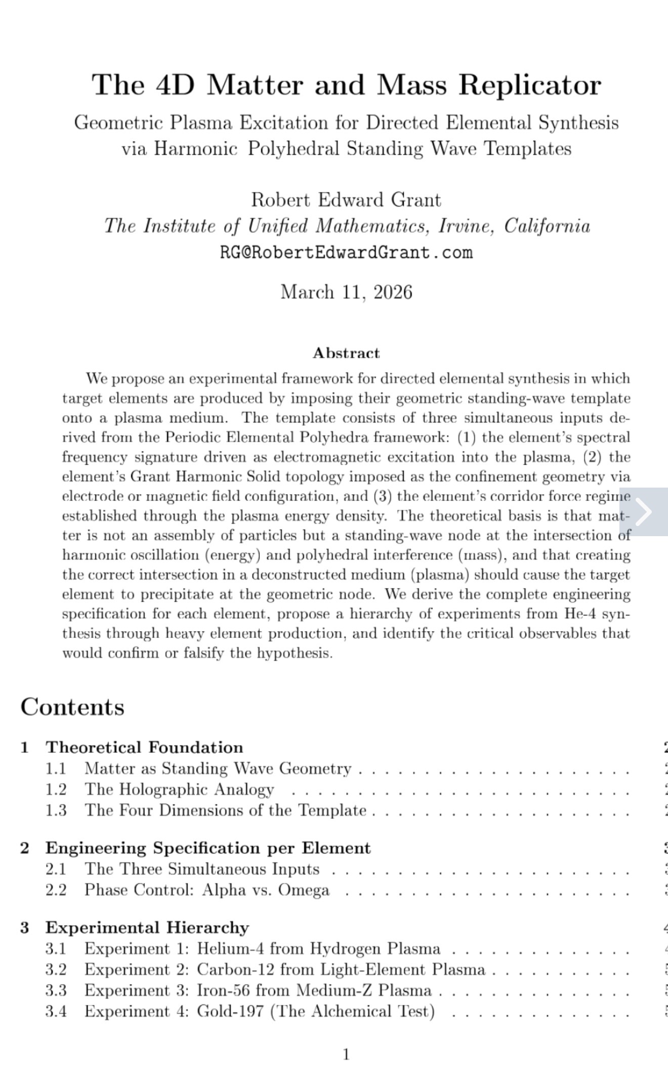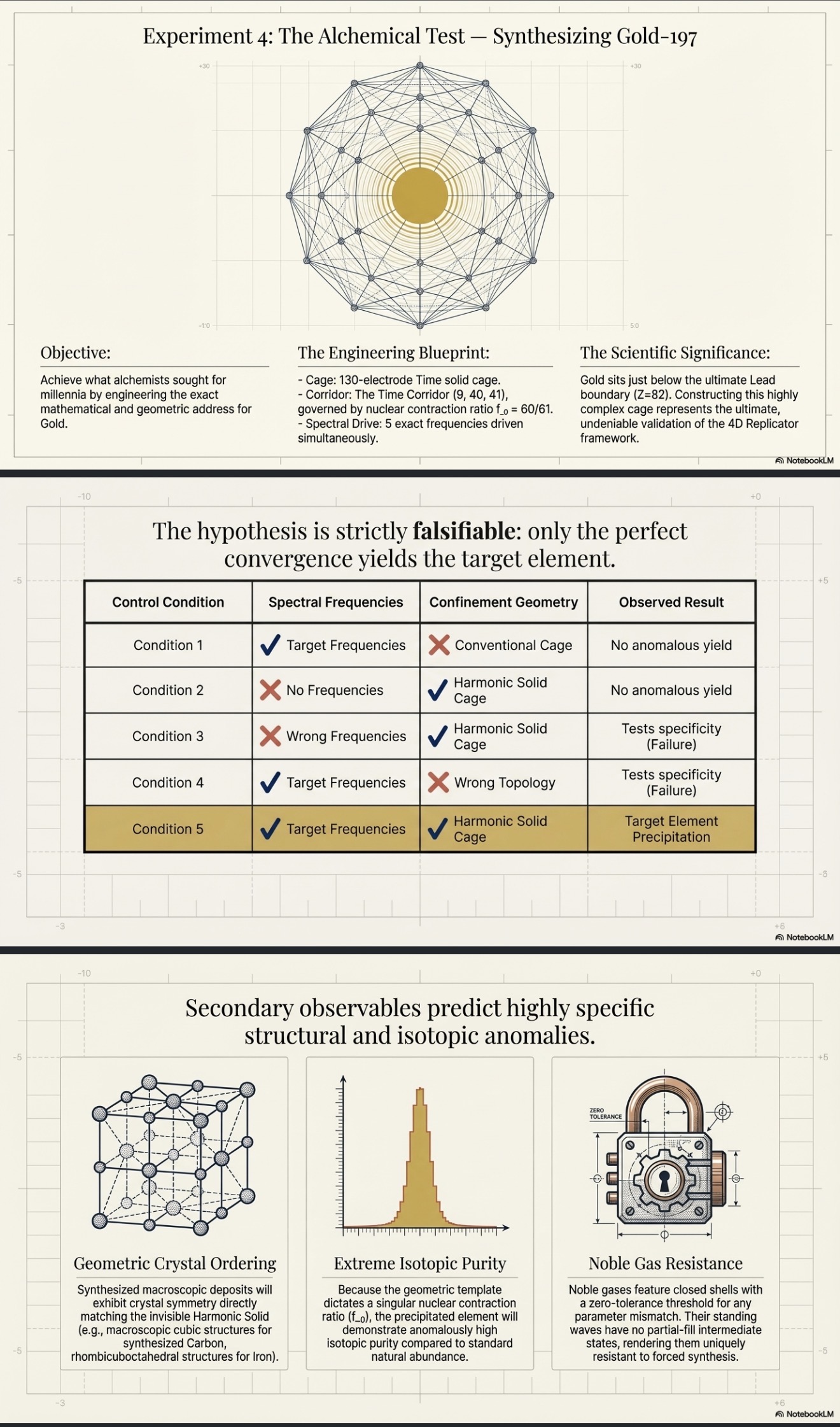 The experimental hierarchy proposed here from He-4 through C-12, Fe-56, and Au-197 provides a graduated test of this hypothesis, with each experiment building on the previous. The controls are rigorous and the predictions are falsiable. Either the geometric template enhances elemental synthesis rates, or it does not. What the alchemists sought through philosophy and the physicists seek through brute force, geometry may provide through resonance.