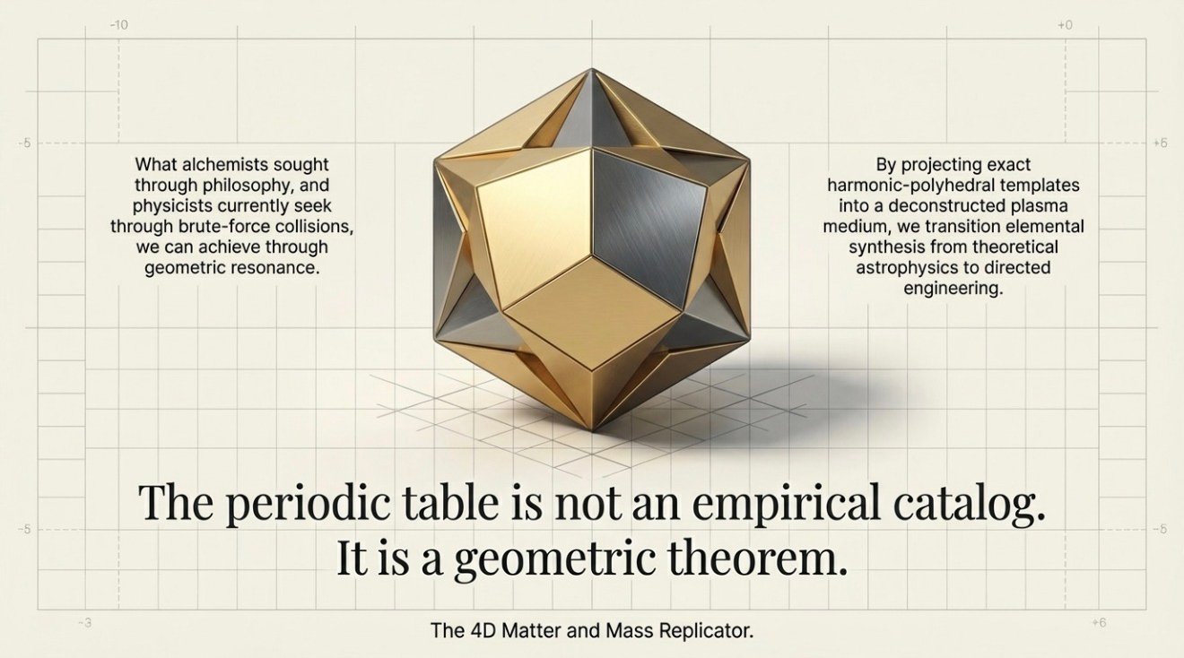 The 4D Matter and Mass Replicator is the engineering consequence of the discovery that the periodic table is not an empirical catalog but a geometric theorem.